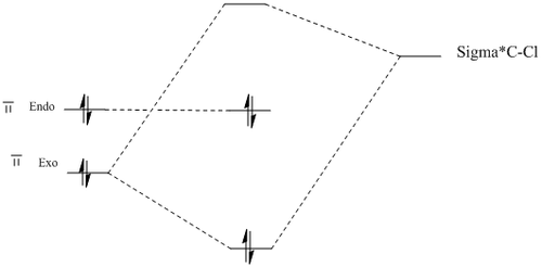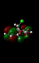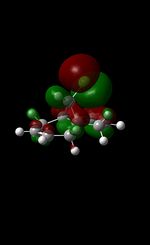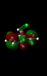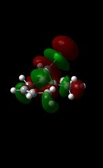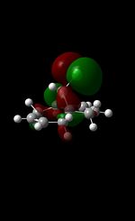 The MM2 force-field was applied to product 12 in order to optimise the geometry of the molecule. In addition to this, the MOPAC/RM1 MO method was used to obtain a representation of the molecular orbitals of Product 12.Initially, the MOPAC/PM6 MO method was used but no success was achieved using this method. Although the RM1 method was then used, the MO’s obtained did not exhibit a large degree of symmetry. RM1 reveals the existence of a bug within the program and hence, as a result of this problem, Gaussian was used (using the DFT method) in order to get a better illustration of Product 12’s molecular orbitals. As shown in the HOMO, most of the electron distribution is located next to the chlorine group and the alkene group situated endo to the halogen atom. Intrinsically, this tells us that this alkene group is much more nucleophilic compared to the other alkene group (endo to the H atom); the chlorine atom induces geometric distortion by causing the whole molecule to twist. In particular, the C-Cl σ* exo π orbital interactions causes the bridgehead and the exo-alkene double bond to move towards each other. Essentially, this will result in an increase in the nucleophilicity of the endo-alkene double bond (making it more reactive to dichlorocarbene). Another explanation for this increase in nucleophilicity, as proposed by Hehre, may be due to the ‘large sterically accessible π orbital area’[5] exhibited by the endo-alkene (as opposed to the exo-alkene). However, one should note that there is some small preference for the exo-product in terms of the ‘Cie-plak’ type effect[6]but this is not enough to override the endo-preference indicated previously.