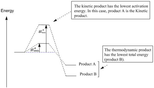 By comparing the endo and exo isomer, it can be seen that the exo isomer is lower in energy (ca. 2.1Jmol-1) than the endo isomer. This difference in energy is due to the 1,4-strain experienced by the endo isomer (this is indicated by a large difference in the torsion energy component). As the exo isomer has a lower total energy, it confirms that this isomer is the thermodynamic product while the endo isomer is the kinetic product for this reaction