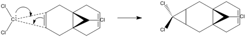 In this part of the module, the semi-empirical method will be utilised in order to obtain an accurate prediction of the reactivity of molecules. This approach is known as ‘semi-empirical’ as the method incorporates the use of theoretical approximations with experimental observations. In this case, we will examine the reactivity of 9-chloro-1,4,5,8-tetrahydro-4a,8a-methanonaphthalene (product 12) in the presence of dichlorocarbene (electrophile). As reported by Halton, Boese and Rzepa,[4], Product 12 reacts regiospecifically with dichlorocarbene at the double bond which is situated endo to the chlorine atom.