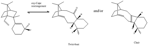 From the results obtained, it can be seen that,in most cases, the chair conformers are lower in energy with respect to the twist-boat conformer. The chair conformers are arranged so that the Hydrogen atoms are staggered, hence, avoid steric clashing. However, the Hydrogen atoms in the twist-boat conformer are held in an eclipsed configuration thereby causing steric clashing to increase. This causes the molecule to destabilize to a small degree. However, the chair' conformer (Product 9 - Carbonyl down) is higher in energy than the twist-boat conformer. From the data analysis, one can see that the bend strain contributes a lot to this. Furthermore, it appears that on average, the conformers of Product 9 (carbonyl down) are 5.64kcal/mol more stable than their product 10 (carbonyl up) counterparts. Once again, this difference in energy is largely due to the angle strain; it appears that when the carbonyl moiety is facing upwards (above the plane), it experiences a greater degree of steric clashing, possibly with the carbon bridgehead.In addition to this, the two methyl groups attached to the bridgehead may provide additional steric strain to the molecule (as they clash further with the carbonyl moiety).