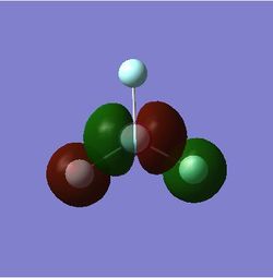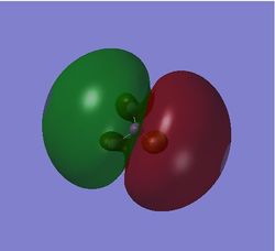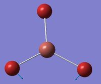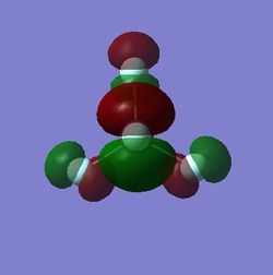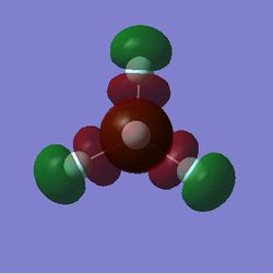 The first three NBOs involve the central boron atom and one hydrogen atom. The boron atom contributes 44.48% to each MO where 33.33% is s-character and 66.67% is p-character. The hydrogen atom contributes 55.52% to each MO (where 100% is s-character). Therefore the first three molecular orbitals are sp2 hybridised. The fourth NBO is the s atomic orbital of boron and therefore the boron atom contributes 100% to the MO and it is 100% s-character. This does not match the qualitative MO prediction, which places the fourth NBO as a non-bonding pz orbital, which would there be 100% p-character. The fifth NBO corresponds to the boron unoccupied lone pair and therefore should have 100% p-character; however the computational calculations indicate that it is 100% s-character which is obviously wrong. This discrepancy between the calculated outcome and the qualitative prediction demonstrates that although computational modelling and analysis does at times give quantitative information that would have to otherwise mathematically calculated, it is not always accurate.
