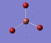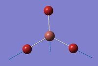 Despite vibrational analysis predicting six vibrational modes for BH3, the IR spectrum obtained only illustrates three. This discrepancy between the spectra and the frequencies identified can be explained by the fact that there are two sets of vibrations which have the same frequencies and therefore correspond to the same vibrational mode. There are two vibrations at 1203.64 cm-1 and two vibrations at 2737.44 cm-1, therefore four of the vibrational modes identified actually contribute to two of the vibrational modes seen in the IR spectrum. The vibrational mode found at 1203.64 cm-1 is due to two degenerate vibrational modes, with symmetry E’, and likewise the vibrational mode at 2737.44 cm-1 is a consequence of two degenerate vibrational modes again with symmetry E’. Furthermore, one of the vibrational modes identified by the vibrational analysis has an intensity of 0.0000 and therefore exhibits no dipole moment. This vibrational mode has A1’ symmetry and is therefore totally symmetric and therefore will have no dipole moment. This vibrational mode is therefore IR inactive and will not be observed in the IR spectrum. The computational predictions for the vibrational modes of BH3 were found to be very consistent with the literature values, with a very marginal error associated on average between the calculated values and the literature values.