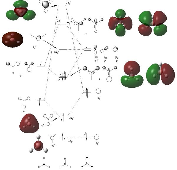 The quantitative molecular orbitals of BH3 were calculated using Gausseview 5.0. The checkpoint file from the optimisation of BH3 was opened and a duplicate file was saved for the Mo calculation. To calculate the Mo orbitals by talking into account the electronic structure of the molecule the job type was altered to ‘Energy NBO’ and ‘Full NBO’ was selected in the NBO tab. This was submitted to scan and the checkpoint file was then opened and the molecular orbitals calculated could be visualised and therefore analysed. To access the accuracy of these calculations the qualitative molecular orbitals were represented in the qualitative Mo diagram. The MO diagram was drawn in ChemDraw. The LACO method was used to draw the Mo diagram due to the simplicity of the molecule. The molecule is split into molecular fragments (B and H3) and by using the reduction and projection formulae it was then possible to determine the trigonal planar H3 fragment orbitals. The relative electronegativies of the two fragments was then accessed in order to determine the placing of the H3 fragment orbitals relative to the boron atomic orbitals. The electropositivity of boron and hydrogen is very similar but boron is very slightly more electropositive and therefore lies higher in energy than the fragment orbitals of H3. The symmetry labels were determined and it was then possible to determine the correct mixing. Finally, electrons were then added. The short comings of this qualitative technique for the analysis of the molecular orbitals of a molecule is that it is very difficult to accurately determine the relative energy gaps between MOs and fragment orbitals, although estimation is obviously possible. In order to gain a more precise ‘picture’ computational analysis is needed to gain quantitative information. The two qualitative and quantitative methods of determining the molecular orbitals of a molecule can then be best compared by attempting to match the qualitative MOs drawn with those calculated by computational methods. Obviously, those calculated via computational methods will not necessarily have the distinct p-orbital or s-orbital shapes and therefore one must just try and match them by eye, although it is possible to gain some idea from the general shape of the charge distribution.