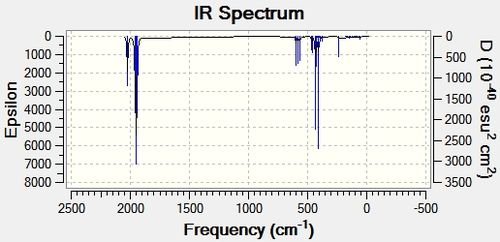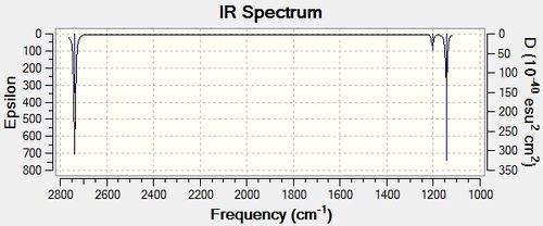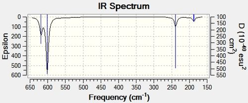 The vibrational analysis identified six different vibrational modes which all contribute to the IR spectrum. These vibrations are tabulated below, shown next to the corresponding values found in literature.