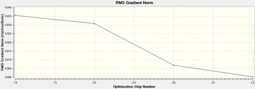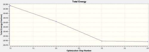 From the optimised BH3 molecule it was then possible to view a graphical representation of the energy and the energy gradient. The graphical representation of the energy illustrates the successive decrease in energy as Guassian alters the positions of the nuclei in order to obtain the arrangement corresponding to the minima of the potential energy surface curve. The graphs illustrated that it took a total of four steps to achieve the minima, and during each of the four iterations the energy of molecule successively decreased, in concurrence with a potential energy surface curve. At the fourth iteration the BH3 molecule reached its minimum energy. The representations of BH3 at each step provided by Gaussian are shown below.