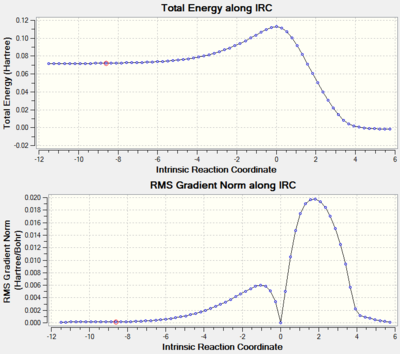 It should also be noted that the C-C bond lengths for the transition states are all closer to those of the starting materials than those of the product; for example, C1-C2 is 1.38 Å in the transition state, which is 0.04 Å larger than C1-C2 in butadiene (1.34 Å), and 0.12 Å smaller than C1-C2 in the product cyclohexene (1.50 Å). Following Hammond's postulate, this suggests that the transition state is an early transition state, where the structure of the transition state is closer to that of the reactants than that of the product. This is confirmed by the IRC graph shown below, whereby the transition state is clearly much closer in energy to the reactants compared to the product.