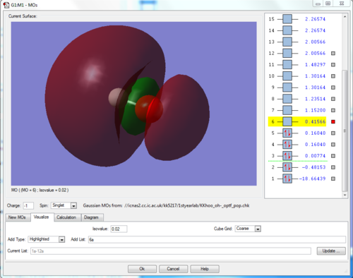 This is the optimisation data shown in the table - however, we can compare this to the literature bond length of the hydroxide anion. In solution, OH- will be surrounded by water molecules, each coming close enough to the negative O atom to form hydrogen bonds; this results in a species that sometimes exists in a more stable state of the hydrogen bonded H3O2-. In this species, the bond length for the O-H is 0.733 Å[1]. However, this is in a crystal structure. By comparison, the O-H bond length in H2O (water) is 0.95718 Å[2]. This is similar to the calculated optimised 0.98339 Å from GaussView. Differences could arise in reality due to hydrogen bonding, which could result in a broad range of slightly fluctuating bond lengths, and the additional proton in H2O.