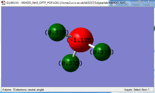 Because nitrogen is more electronegative than hydrogen, a negative charge is expected on the N, since it is known to pull electron density away from the hydrogens and to itself. This is observed in the image above, showing the calculated charges on the N and H are -1.125 and 0.375 respectively. Also note how they add up to 0, showing the molecule has no overall charge.