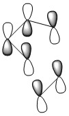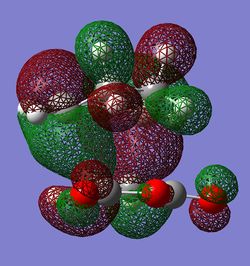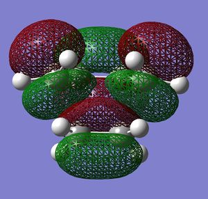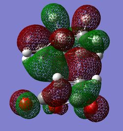 The HOMO of butadiene/ethylene TS from DFT/B3LYP/6-31G(D) calculations is shown on the right. As can be seen this HOMO is different from the HOMO obtained by the AM1 method. This HOMO orbital doesn't resemble any of the HOMO-LUMO interactions mentioned above because it looks like the terminal carbons of butadiene don't contribute their p-orbitals towards this HOMO. There are no nodes at the centers of these carbons. This shows that different methods could interpret the wavefunctions differently which is why different HOMO orbitals were obtained for AM1 and DFT methods. It was discovered that the MO, which is HOMO in AM1, is HOMO-1 in DFT; and the MO ,which is HOMO in DFT,is HOMO-1 in AM1.