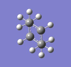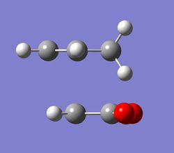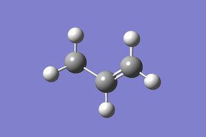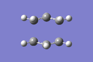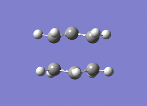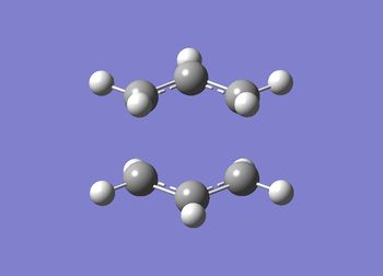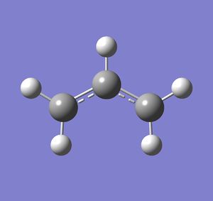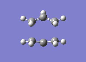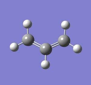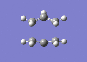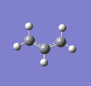 As can be seen from the table above, the bond lengths and angles vary slightly between HF and B3LYP structures. Some of the bond distances(C=C, C-H) are longer for B3LYP structure than for HF, one(C(H2)-C(H)) is longer in HF but the middle(C(H2)-C(H2)) bond is the same length in both cases. The angles vary only slightly. The biggest difference is for C(H2)-C(H2)-C(H) angle which is wider in B3LYP structure. The C(H2)-C(H)-H angle was the same in both structures(to the significant figures given). All the values are also very similar to the literature values. Overall, the bond distances of B3LYP structure are more similar to literature values compared to HF structure. However, there is smaller difference between literature and HF structure angles than there is between B3LYP and literature values. There is a significant difference between literature and computed values of C(H)=C(H2)-H angle. As a result the H-C(H2)-H angle values are also quite different because this angle is dependent on the C(H)=C(H2)-H angle.