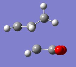 Firstly, an allyl group (CH2CHCH2) was drawn in Gaussview and was optimised using HF method and 3-21G basis set. The LOG file can be found here. The optimised structure was then used to make something similar to the chair transition state for this cope rearrangement reaction. Two of these fragments were moved and rotated until their relative orientation was like the chair transition state. The distances between the terminal ends of the allyl fragments were 2.20 Å. Both of these structures can be viewed below: