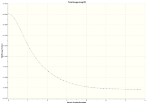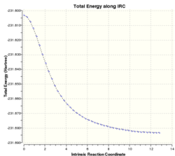 In the animation shown above, it can be seen how the bond forms between the two fragments. Then the molecule distorts to obtain the optimum angles and distances between the atoms(equilibrium bond distances). The distortion also minimises the repulsion between the atoms in the molecule. The image on the far right shows how the IRC analyis proceeded. The energy of the structures decreases smoothly until the lowest energy structure is obtained(gradient=0).
