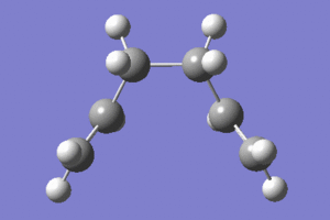 The prediction from theory is that anti-periplanar conformation should be favoured over the gauche conformation, mainly because of the reduced steric interactions in anti-periplanar conformation. Also the information from the literature source[1] indicates that antiperiplanar conformations are favoured. There is not just one anti-periplanar conformation. The most stable conformation of 1,5-hexadiene is for the structure given on right. This conformation was also drawn in GaussView and was optimised using the same method-HF/3-21G. The energy of this app conformation was -231.692602 Hartrees and point group C2 (LOG). This energy is lower than the first anti-periplanar conformation but higher than the gauche one. This is not consistent with theory and prediction where anti-periplanar should be the favoured conformation. The reason could be that Hartree-Fock method was used which is the simplest calculation method and it includes no electron correlation so such factor as orbital overlaps are not properly considered. The summary of results is given: