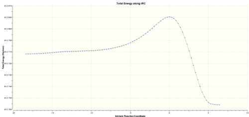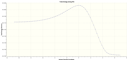 The IRC analysis was also carried out for this reaction. The reaction coordinate was computed both ways(not symmetric path) with 100 points along the IRC bath. The HF/3-21G level of theory was used(DOI:10042/26756 ).