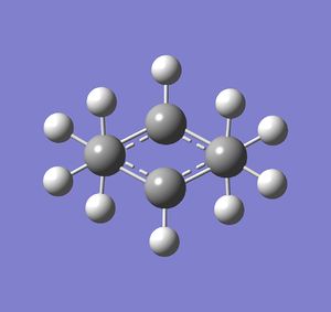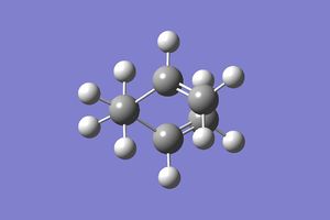 As can be seen, the structure above looks very similar to the chair conformation. It doesn't look like a boat because the rotations around the central bonds weren't considered in this optimisation. In order to obtain boat like transition state structure, the reactant and product structures were modified-the angle of the central four C atoms was set to 0o and the angles C2-C3-C4(reactant), C3-C4-C5(reactant), C2-C1-C6(product) and C1-C6-C5(product) were set to 100o.