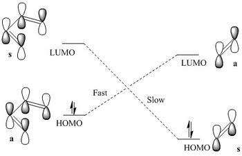 The HOMO and LUMO interactions are crucial in determining the outcome of the cycloaddition reactions. This is also the case for the Diels-Alder reaction between butadiene and ethylene(dienophile). The molecular orbitals at the transition state are formed by the interactions of HOMO and LUMO of both of these species. For the reaction to be allowed the HOMO of one reactant has to interact with the LUMO of the other reactant. This can only happen when the interacting orbitals have the right symmetry because then the orbitals can overlap constructively. If the symmetry of orbitals is different then the reaction is forbidden. For this reaction there are two possible HOMO-LUMO interactions which are symmetry allowed-HOMO(butadiene) with LUMO(ethylene) or HOMO(ethylene) with LUMO(butadiene). The HOMO-LUMO gap of butadiene is smaller than the HOMO-LUMO energy gap of ethylene due to the delocalisation of p-orbitals. As can be seen in the diagram on right, the HOMO(butadiene)-LUMO(ethylene) gap is smaller compared to HOMO(ethylene)-LUMO(butadiene) energy gap. This means that smaller energy is needed for the HOMO(diene)-LUMO(ethylene) interaction and therefore the Ea is also smaller which gives faster reaction via these orbital interactions.[4]