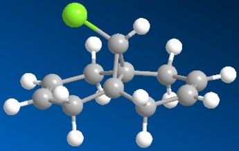 Compound 11 (shown above, on the left) has 2 6-membered rings fused together, with a bridging C atom that is bonded to a Cl atom. Minimisation using the MM2 force-field gives a structure shown above (on the centre) where the 2 6-membered rings are found to have an identical conformation. Both the 6-membered rings are slightly bent and the energy of structure 11 is calculated to be 74.94 kJ/mol. Application of the MOPAC/PM6 method on the pre-optimised structure of 11 gives a slightly different result for the structure (shown above, on the right). The 2 6-membered rings are now completely different as they have different configurations. The 6-membered ring directly below the Cl atom has a planar configuration while the other 6-membered ring which is away from the Cl atom has the bent configuration (unchanged). The heat of formation of compound 11 with this structure is given as 82.65 kJ/mol - slightly higher than the energy of the structure given by the MM2 force-field minimisation (74.94 kJ/mol). The HOMO-1, HOMO, LUMO, LUMO+1 and LUMO+2 orbitals of compound 11 are obtained from the MOPAC/PM6 calculations and are shown below: