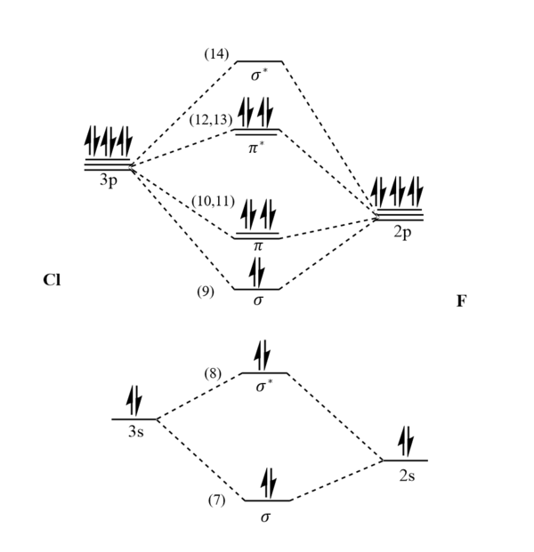 Only Orbitals 1-14 were examined as they represent the lowest energy orbitals, orbitals of higher energy did not contain electrons and there was large uncertainty in their shapes. Orbitals 1-6 were determined to be the shapes of the core atomic orbitals, which do not participate in bonding. Starting from Orbital 7 the molecular orbitals began to appear, these were then examined more closely. In all the screenshots of the molecular orbitals bellow the Cl is shown as the green molecule on the left and F is the blue molecule on the right. A molecular orbital diagram can be drawn from theory which can help identify the molecular orbitals seen bellow:
