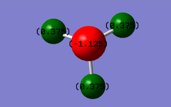 The charges can be seen in the picture bellow. The charge on the N is -1.125 and the charge on the H's is 0.375. This is expected because the Nitrogen is more electronegative compared to the Hydrogen's therefore it would have a slightly negative charge as it pulls the electron density closer to itself.