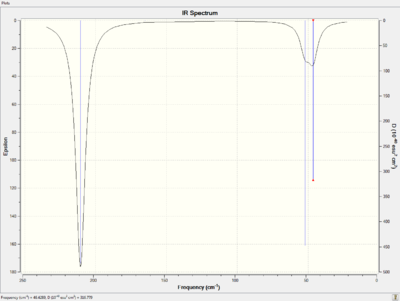 According to the spectrum, the first observable peak occurs at 46 cm-1 which is much greater than the low frequencies recorded above. These low frequencies are very close to zero which indicates a good optimisation method is applied.