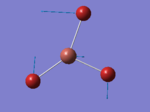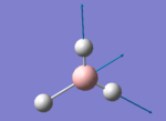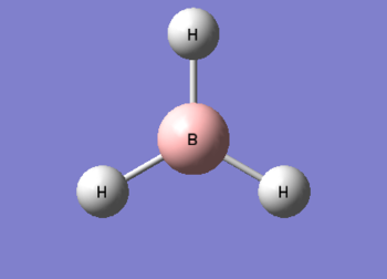 A BH3 molecule of trigonal planar geometry was created using Gaussview 5.0 and optimised by B3LYP DFT method with 3-21G as the basis set. This is a very quick calculation carried out by Gaussian 09W of finding the optimum configuration of the molecule with a low level of accuracy in terms of the setups. B3LYP applies Hartree-Fock methodology to the exchange correlation terms to produce hybrid functions and solves Schrodinger equation for the electron density. [1] As more accurate basis set applying to the molecules, the time taken for the calculations will increase. The optimisation of the molecule tries to obtain a minima point on the potential energy surface which has the gradient of energy equals to zero. The B-H bond length was initially set to 1.5Å. File:BH3 OPT.LOG