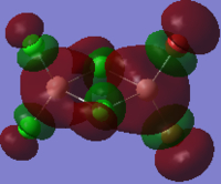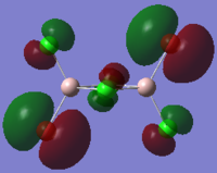 From the MO diagram, it can be seen that the HOMO is located at the eighth energy level while the LUMO on the ninth energy level. The energy difference between the HOMO and LUMO are relative large comparing to other energy gaps. Nevertheless, the LUMO is still Lewis acidic and be able to accept electron pairs from other molecules. If an additional pair of electrons are added to the vacant energy levels i.e. LUMO, the overall energy of the molecule will not be destabilised. The predicted 3D orbitals are in good consistency with the drawn orbitals. The vital feature is that the 1b3u orbital contributes the most to the bridging 3c-2e bonding.