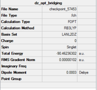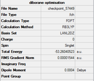 Diborane was drawn using GaussianView 5.0 and optimised by B3LYP DFT method with the basis set of LanL2DZ. The optimised structure of the molecule and its summary are shown below.