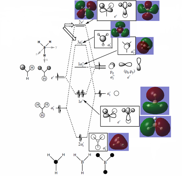 A full molecular orbital diagram is obtained by linear combination of molecular orbital with the same symmetry. The two fragments used in this MO is the trigonal planar fragment H3 orbital and the atomic boron orbital. By comparing the electronegativity of boron and hydrogen fragment, it is easy to find that boron is slightly more electropositive. Therefore, when allocating the energy levels, the boron atomic orbital should be placed in slightly higher energy. After successfully mixing the orbitals of the two fragments with the same symmetry, electrons are filled up from the lowest energy levels. The energy of 1s atomic orbital of boron is very low so that it does not participate the orbital mixing though it has a1' symmetry. According to the energy levels shown above, the fourth energy level is the HOMO and the fifth energy level is the LUMO.