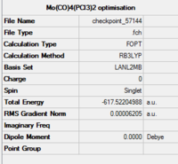 The isomers are first optimised using loose LanL2MB method to obtain roughly minimised structures which could be used for further optimisation. As the first optimisation is done, manipulation is required to alter the structure of the two isomers so that the time of computational work would decrease. For cis isomer, one chlorine atom is adjusted to point up parallel to the axial bond while that one chlorine atom of the other group points down. The Mo centre is fixed. For trans isomer, both PCl3 groups are in the eclipsed conformation which one the chlorine atom of each group lies parallel with one of the Mo-C bond. The basis set is then changed to ultrafine LanL2DZ which is a more accurate calculation method. The structures and summary of the loose and ultrafine optimisation of the cis and trans Mo(CO)4(PCl3)2 compounds are summarised in the table below.