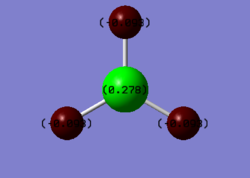 The values of charge represented in the diagram are analysed and found to be the same as in the file. The three hydrogen atoms has the same value of charge and they cancel out with each other because of the highly symmetric structure. The file below provides information about the bond orbitals of the molecule.