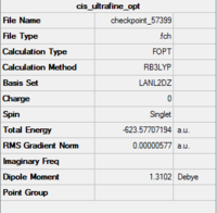 According to the table, after apply the ultrafine LanL2DZ method, the energy of formation decreases for both cis and trans isomers. It confirms that the further optimisation processes are successful. The expected point group for cis isomer is C2v and for trans isomer is D4h.