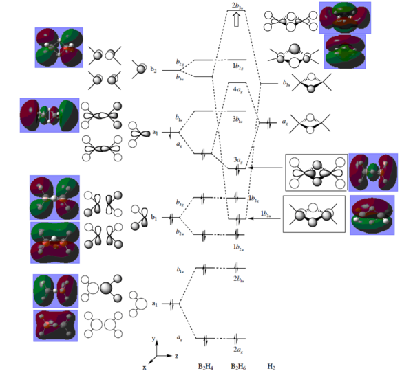 A full molecular orbital diagram is obtained by linear combination of molecular orbital with the same symmetry. The two fragments used in combination are B2H4 and H2 units.