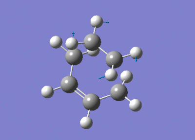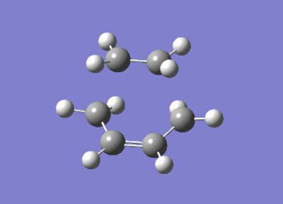 The Transition state was made by selecting a bicyclic system on Gaussview and removing the -Ch2-Ch2- bridge. This ensured the structure was in an envelope position. Another 2 bonds were deleted in order to separate the two fragments (but-2-ene and ethene); the distance was specified to be 2.2Å. An opt+freq job was run optimizing the molecule to a TS Berny at the AM1 level of theory. The optimized strucutre is reported below. to-11546