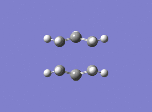 A CH2CHCH2 fragment was drawn and optimized using the HF/3-21G level of theory DOI:10042/to-11360 . The optimized structure was then pasted twice on a new Guassian window and the distance between the two terminal ends of the allyl fragments was set to 2.2A. The product was made to look as similar as the presumed chair transition state as possible. The guessed structure was then optimized using two different methods: the Berny method and the freeze coordinate method.
