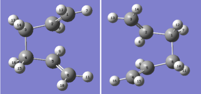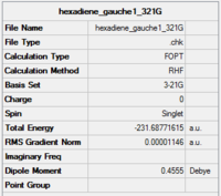 The HF/3-21G basis set was used to optimise ten possible conformations of 1,5-hexadiene. The following table summarises the energy and point groups of the possible conformations of 1,5-hexadiene.