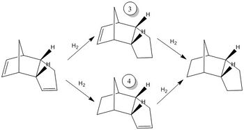 Hydrogenation of the endo dimer proceeds to give initially one of the dihydro derivatives 3 or 4. Only after prolonged hydrogenation is the tetrahydro derivative formed.