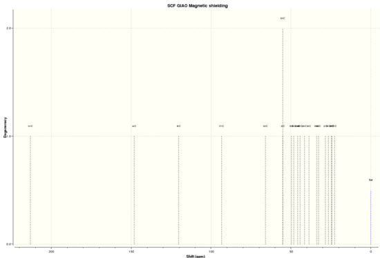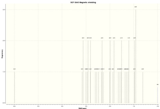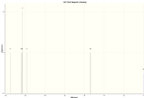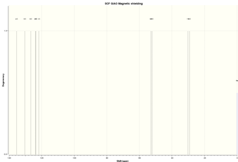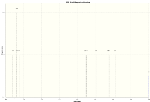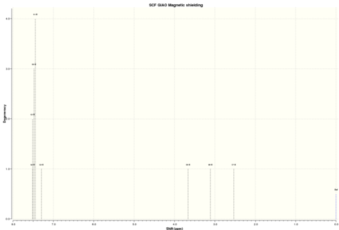 By using Avogadro's Gaussian Geometry optimization and illustrating using GaussView, the following NMR data was obtained. The .log file of the simulation can be found here, and the digital repository here DOI:10042/28194 .