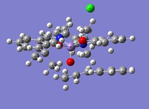 Molecule 23 has a 5-coordinated manganese centre with a square pyramidal structure where 4 atoms joined by ring-like structures and bridges are coordinated to the metal center in an approximate plane, with a perpendicular chlorine atom coordinated to the metal center. This approximate planar nature is due to the delocalisation of electron densities at the salen ligands at either sides. The cyclohexane ring adopts a low energy chair conformation and has two chiral C atoms attached to N, thus defining the stereochemistry of the Jacobsen catalyst to be either (R,R) or (S,S).