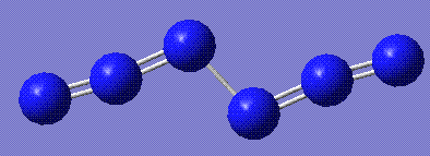 The isodiazide structure was perhaps the most surprising result. In an effort to identify as many possible different forms of N6, several fairly exotic structures were submitted to SCAN, but the inherent instability of the starting cluster made it unlikely that any of them would come back positive. But in fact the 1,3 dimethylcyclobutane analogue and the propylcyclopropane analogue came back as having a stable form. While the latter was then revealed to have a negative frequency, the former had only positive values and was therefore a legitimate isomer of N6. It is closely related to the structure of the diazide, where the linkage is between the terminal nitrogen of one and the middle nitrogen of the other. Bond lengths are consistent with reported N-N values. Its energy is fairly high, though, indicating that this is not the preferred form.
