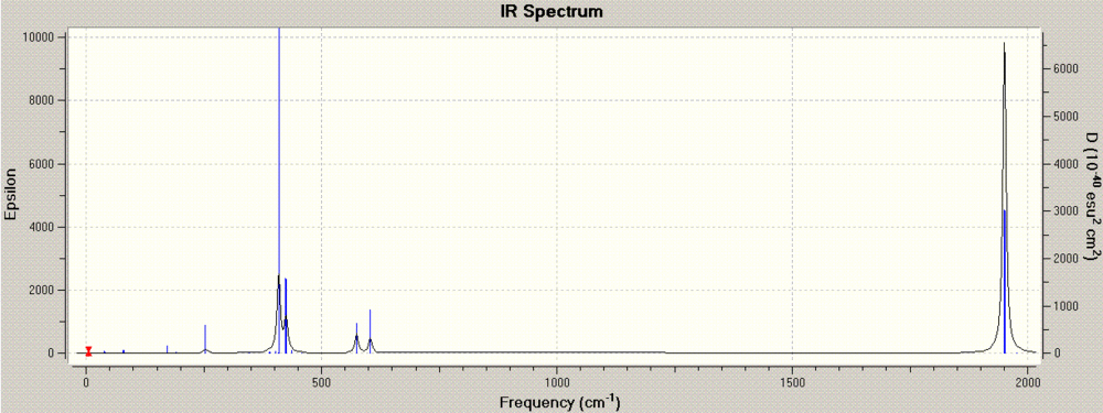 The strongest modes are those that give rise to an overall change in dipole, and therefore we can expect that the stretches involving the movement of the C=O double bond to have higher intensities. Similarly, we can expect the cis form, which doesn't have as much symmetry as the trans form, to have more IR active stretching frequencies. Indeed, we can expect 3 vibrational modes for C=O in the cis form and 1 in the trans form[4][5]. The computed C=O stretches occur at 2023, 1958, 1949 and 1945 cm-1 for the cis form and 1951 and 1950 cm-1 for the trans form, in apparent contradiction with theory. This is because the geometry is, in this case, non costrained to the native C2v (cis) and D4h (trans) point groups. If the calculation were more precise, we would be able to have the precise number of stretches. We can already see that the trans frequencies are very close and hence they present one overall peak, despite being two distinct vibrational modes. The cis frequencies approximate the literature values of 2023, 1927, 1908, 1897 cm-1[6].