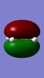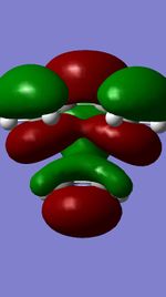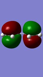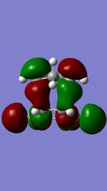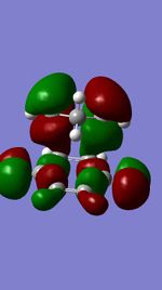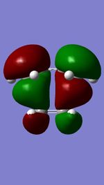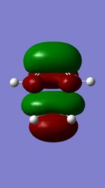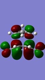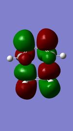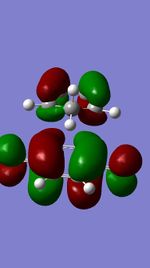 The Diels-Alder reaction between butadiene and ethylene was investigated. The frontier orbital MO diagram of the transition state between the two reactants can be seen in Figure 1 and the HOMO and LUMO of the reactants can be seen in Figures 2,3,4 and 5. These orbitals can be combined in the way shown in Figure 1 to produce the MOs seen in Figures 6,7,8 and 9. The orbitals can only combine if they have the same symmetry; an ungerade-ungerade interaction and gerade-gerade interaction will have an orbital overlap of non-zero. An example of a non-zero orbital overlap is when the HOMO of butadiene combines with the LUMO of ethylene, they both have ungerade symmetry. If two MOs with different symmetry try to combine the orbital overlap will be 0 i.e. non bonding.