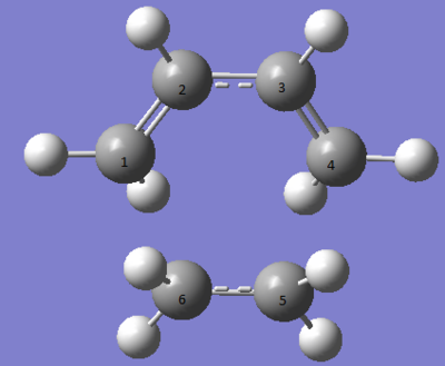 Table 1 shows that all of the bonds in the reactants, apart from the C-C bond in butadiene, get longer as the transition state is formed. This is expected because the double bonds are breaking and so they become more like single bonds which are longer, and the single bond in butadiene becomes a double bond so it gets shorter. Most of bond lengths in the transition state are between the lengths of an sp3 and sp2 carbon. [2] The calculated data matches the data that Goldstein et. al. found.[3] The Van Der Waals radius for a carbon atom is 170Å