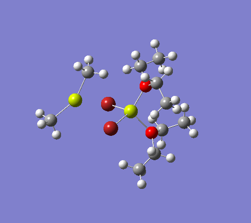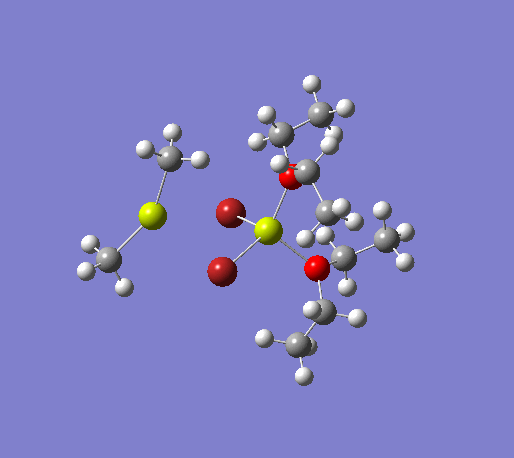 An initial structure optimisation using the DFT/B3LYP method and a LanL2MB basis set (opt=loose) was made for the MeMgBr dimers in which the methyl groups are in the terminal positions. There are several possible options, one where the methyl groups are on the same Mg atom, and the other Mg atom coordinates to two ether molecules, another where the the methyl groups are on opposite Mg atoms. The latter structure can exist as cis and trans, but due to time constraints we will only focus on the trans isomer. These two basis structures were used to build the other models, and a more accurate LanL2DZ basis set (int=ultrafine scf=conver=9) was used to further refine them. The table below shows the structures, energies (LanL2DZ), jmol structures, and the link to the digital object identifier for the calculation.