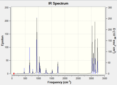 The B3LYP/6-31G* anti2 1,5-hexadiene structure was subjected to frequency analysis on Gaussview 5.0.9. An infrared (IR) spectrum was computed as a result of this analysis, this spectrum is shown in diagram 8 below. The .log file for this frequency analysis can be found here File:QLO15HEXADIENEANTI2OPTDFT2.LOG.