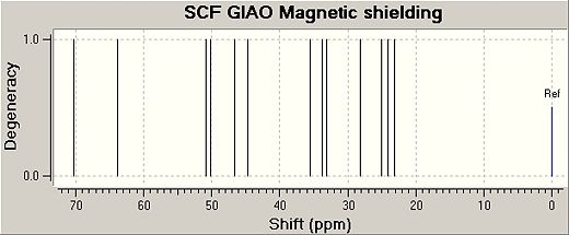 The following predicted Carbon NMR spectra were obtained by minimising the energy of each isomer with the MM2 force field and then by using the method DFT=mpw1pw91 and the basis set 6-31G(d,p) an input file was created and sent to scan. Once the geometry had been optimised by scan the output file was renamed and the code was changed, this modified file was sent to the scan again to obtain an NMR data file. The NMR reference used was TMSmPW1PW91/631(d,p)CDCl3GIAO.