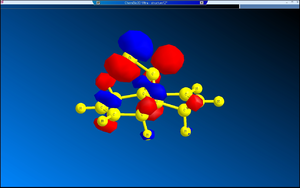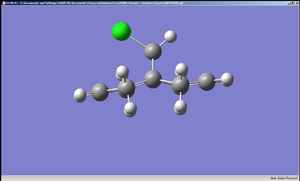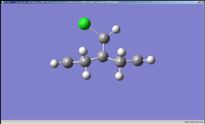 The diagrams of the optimised geometry were all taken from the side, along the plane parallel to the C=C bonds (both the C=C bonds are positioned parallel to the plane of the diagram). At first glance there seems to be no difference but a careful observation reveals that in MM2 and HF optimised geometries the two rings look symmetrical with the mirror place cutting through the Cl – C – H angle but in the case of B3LYP optimised geometry the rings are no longer symmetrical – the ring endo (syn) to the chlorine straightens out while the ring exo (anti) to the chlorine remains slightly bent. One possible explanation is that this difference arises from anomeric effect – whereby the π electrons of the C=C anti to the chlorine interacts with the C-Cl σ* orbital[7]. If this were the case, there should be a weakening of the C-Cl σ bond, which would result in increased C-Cl bond length and decreased distance between C’ (the carbon to which the chlorine is attached) the midpoint of the C=C anti to the Cl[7].