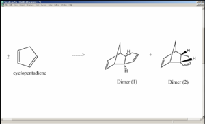 Dimerisation of cyclopentadiene can lead either to the exo-product (structure 1), where the two rings of the reactants are positioned in such a way that intramolecular steric repulsion is minimised, or to the endo-product (structure 2), where the two rings converge. Steric considerations suggest that structure 1 is lower in energy, yet it turns out that dimer 2 forms more readily[1].