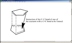 As shown in the diagram on the right, the transition state in the reaction leading to 2 has an interaction between the unreacting C=C bond and a C=C bond about that is about to be formed (in other words, a build up of π electron density)[2]. This lowers the energy of the transition state and hence the activation energy of the reaction, making the rate of formation of 2 far greater than that of 1. The geometry of the transition state explains the fact that 2 was particularly higher in energy than 1 in terms of torsion (tetra-atomic[1]) - for the interaction mentioned above to take place, the unreacting C=C bond would have to be positioned sufficiently close to the C=C bond to be formed, which obliges the two cyclopentadiene rings to align themselves nearly parallel to each other.