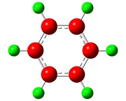 The calculated data, when compared to that of Benzene show some similarity, with a more negative optimized energy. The bond length is very similar, evidence that even though chem draw has shown a single bond the system may have similarities to Benzene. Finally the bond angle is distorted from an perfect hexagon's 120 degrees. This is different to Benzene where angles are all the same.