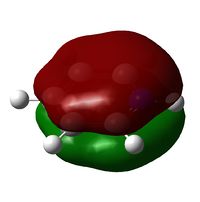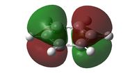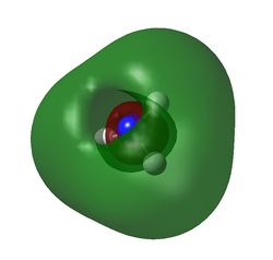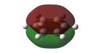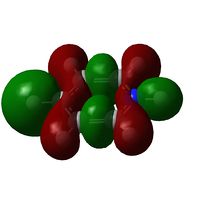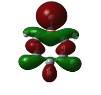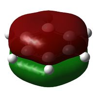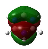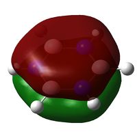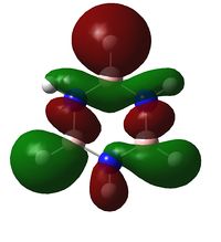 | Comparison | Top and bottom lobes equal in size. Electron distribution is even across the four green Hydrogens. | Boron has larger lobe (top) than Carbon opposite (bottom) due to larger electron cloud. Also note the reduced electron density on Hydrogens adjacent to Boron | Large lobe on Carbon opposite Nitrogen (right) that has a smaller lobe than seen with Benzene analogue. There is greater electron density, (lots of charge in not much space) and all Hydrogens are fully covered by MO's at their current probability distribution. | As expected from the previous two we see Boron with large lobes and Nitrogen with small. Nitrogen has larger orbitals on Hydrogens adjacent and Boron smaller on adjacent Hydrogen atoms |